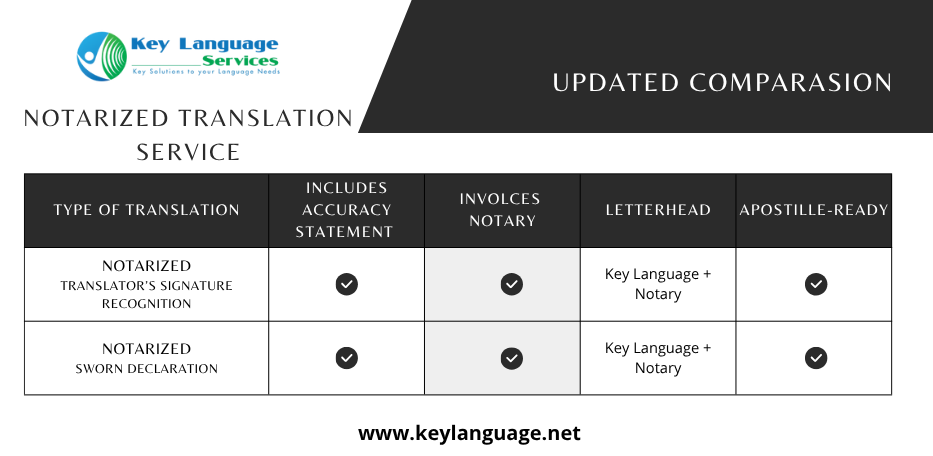 At Key Language Services, we offer two types of notarized translations, both backed by legal certification and professional standards. These services are ideal for immigration, legal, academic, and administrative procedures that require formal validation before national or international authorities.